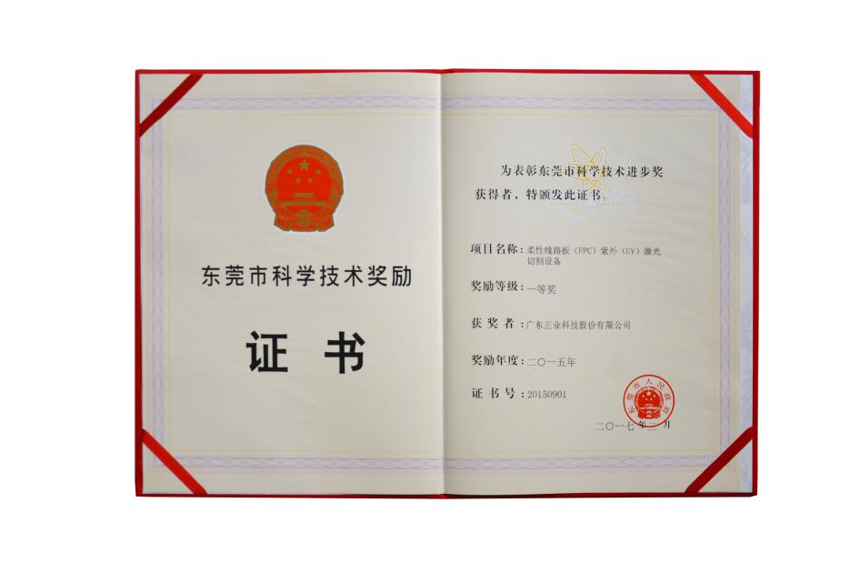 2017年3月,由東莞市政府頒發,廣東正業科技股份有限公司(股票代碼:300410)榮獲東莞市科技進步一等獎,獲獎項目為“柔性線路板(FPC)紫外(UV)激光切割設備”。