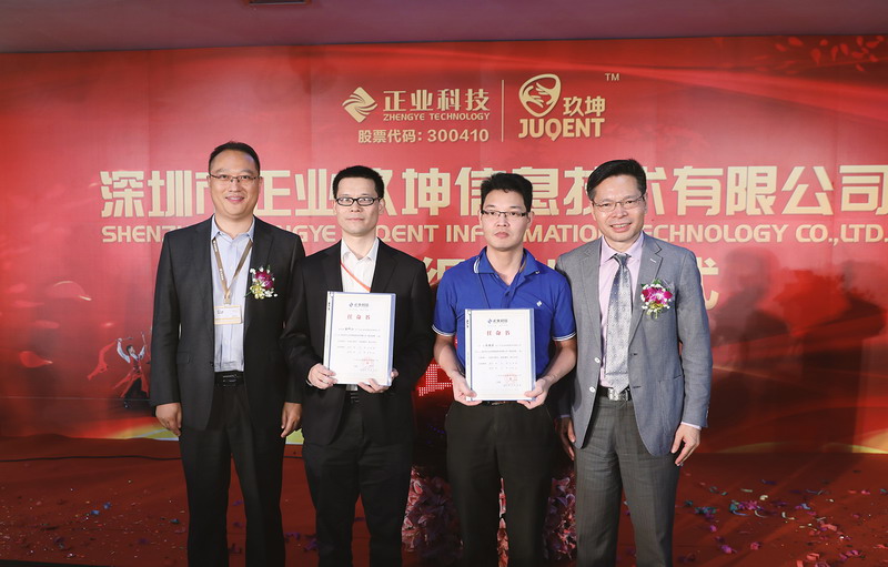 在龐克學總經理激情洋溢的講話后,揭牌儀式正式啟動。在眾多嘉賓和公司精英的見證下,正業科技董事長徐地華、副總裁徐國鳳女士、副總裁徐地明、正業玖坤總經理龐克學、副總經理盧亞男女士共同按下揭牌儀式啟動球,標志著深圳市正業玖坤信息技術有限公司正式揭牌成立。